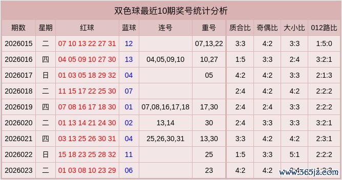 012路比分析:上期红球开出012路比为1:2:3,其中2路表现较热,最近10期红球012路比为18:25:17,本期012路比参考2:2:2。