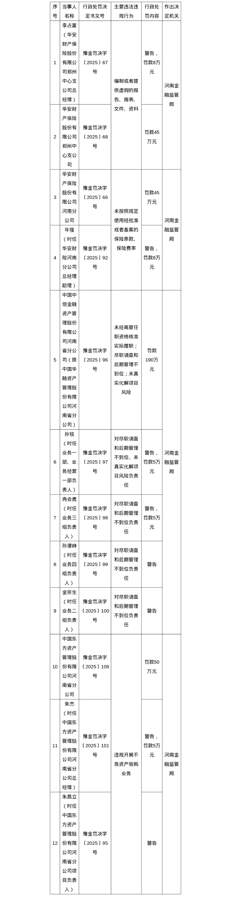 罚单显示,中国中信金融资产管理股份有限公司河南省分公司(原中国华融资产管理股份有限公司河南省分公司)主要违法违规事实(案由)为:未经高管任职资格核准实际履职;尽职调查和后期管理不到位;未真实化解项目风险。